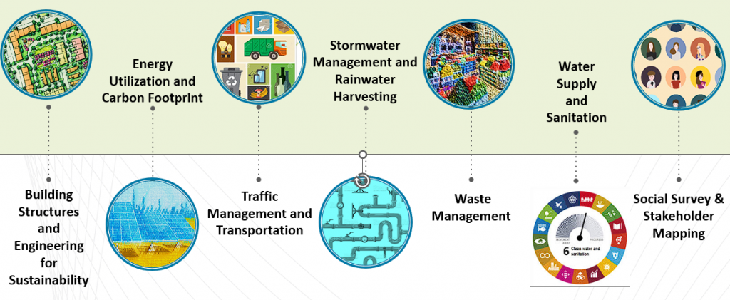 To effectively achieve the project objectives, IITM has outlined plans across several domains, Encompassing Waste Management, Water Supply and Sanitation, Stormwater Management and Rainwater Harvesting, Building Structure & Engineering for Sustainability, Energy Utilization and Carbon Footprint, Traffic & Transportation, and Social Survey & Stakeholders Mapping. The teams have been formed for each domain, comprising IITM Faculty members, Consultants, Project Staff, and students. The project progress is structured in four stages: Inception Report, Status Quo Report, Concept Project Report, and Detailed Project Report (DPR).